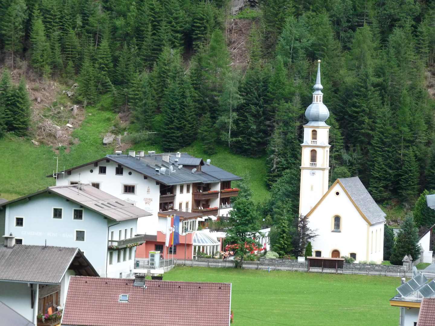 Blick auf den KirchenwirtBlick von dem Talwanderweg auf den Kirchenwirt, rechts daneben die Kirche. Die Glocken sind aber über Nacht abgeschaltet.