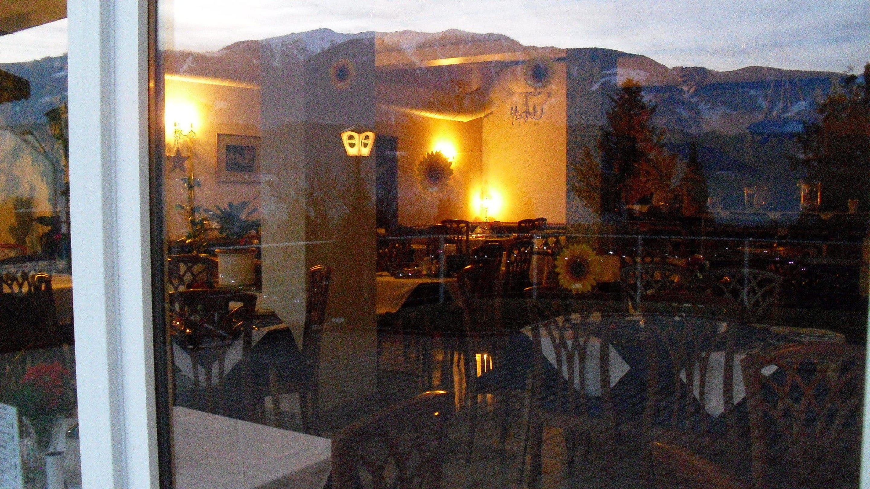 Blick durch die Terrassentür in das Restaurant