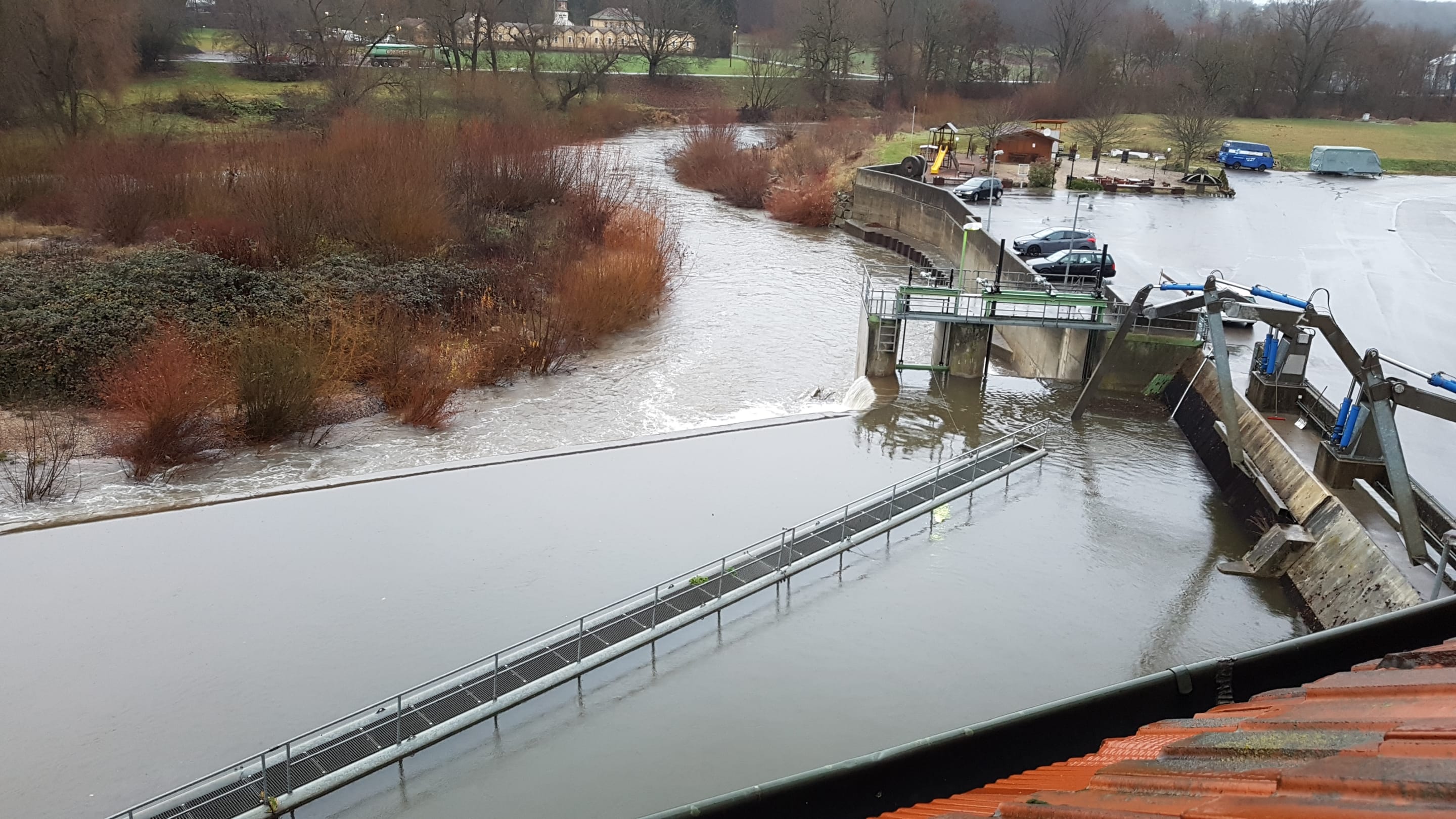 Ausblick von Zimmer 1 auf das Wehr und den Parkplatz.T