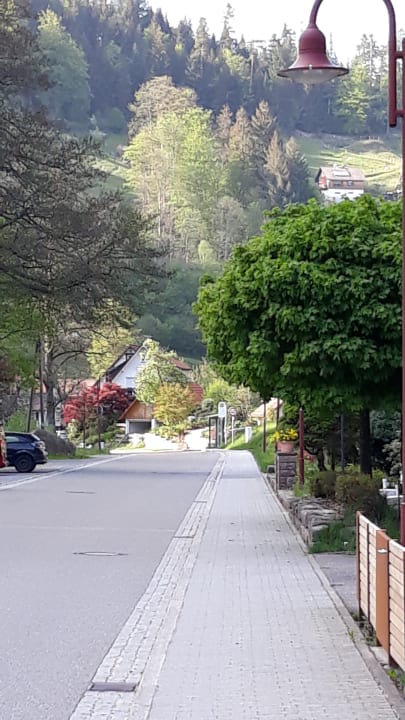 Blick entlang der Straße vor dem Hotel
