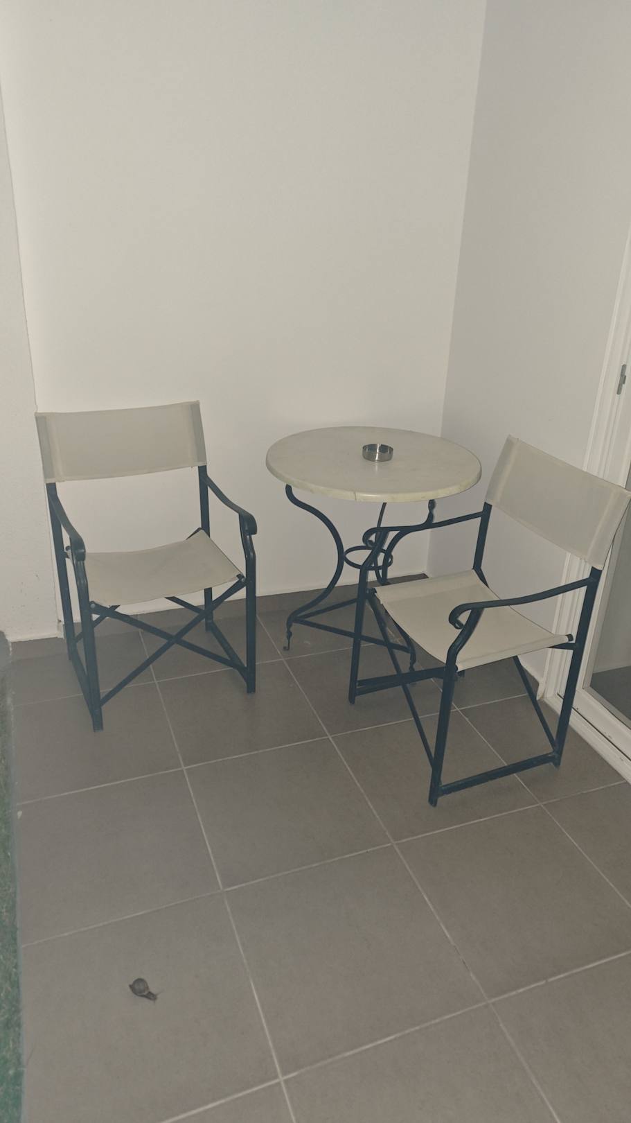 Terrasse mit kleinen Tisch und Wäscheständer. In Wirklichkeit schöner als auf dem Foto 😉