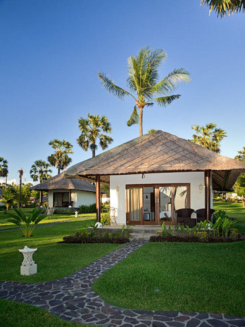 BungalowVorne ein Beach Bungalow mit Meersicht und hinten, die zweite Reihe, ein Garten Bungalow. Sie sind baugleich.