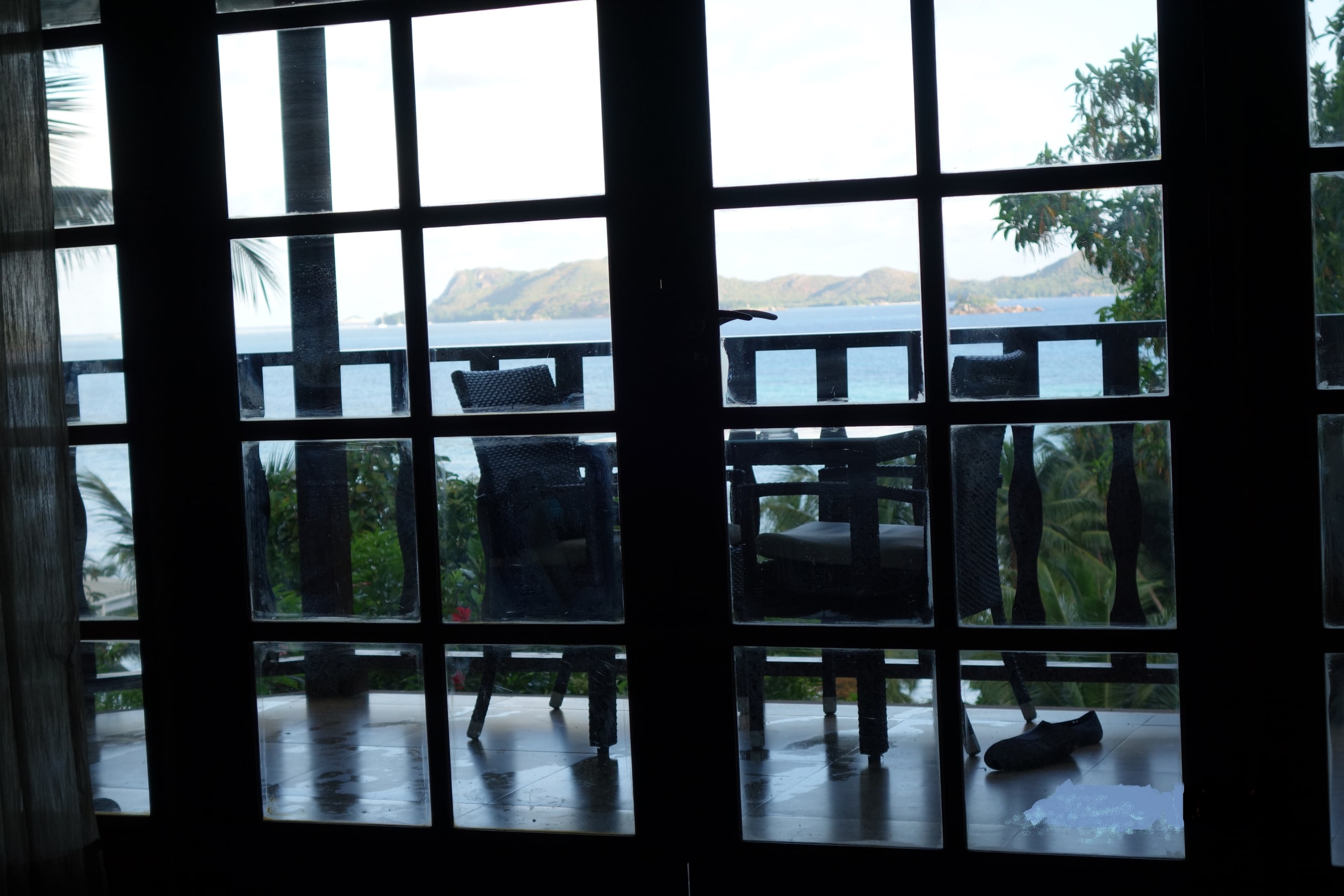 morgendlicher Ausblick vom Bett des Zimmer 6 aus auf die sehr sehenswerte Nachbarinsel Curieuse und das kleine Schnorchelparadies St. Pierre, wohin man (je) vom Hotel aus einen wunderschönen Bootstagesausflug unkompliziert orden kann