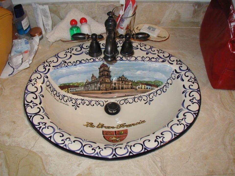 Das kunstvolle Waschbecken im Bad unseres Standardzimmers.