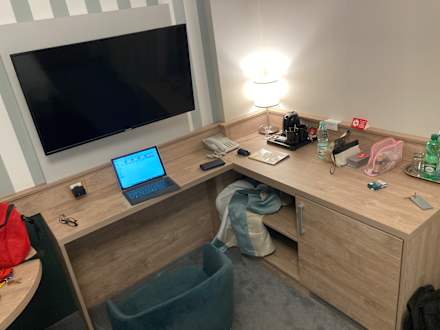 Alter Blaupunkt-Fernseher mit vernichtendem Netflix. Schreibtisch geeignet für Homeoffice. Internet um 30mbit. Kühlschrank (nicht in der Zimmerbeschreibung erwähnt)