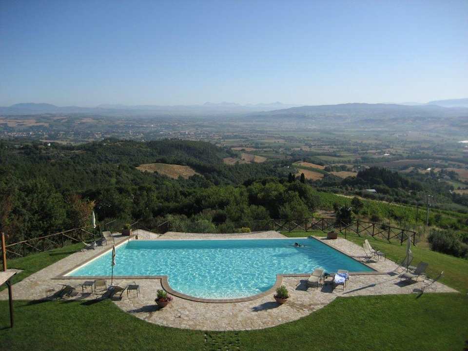 Blick von der Terrasse auf den Pool.