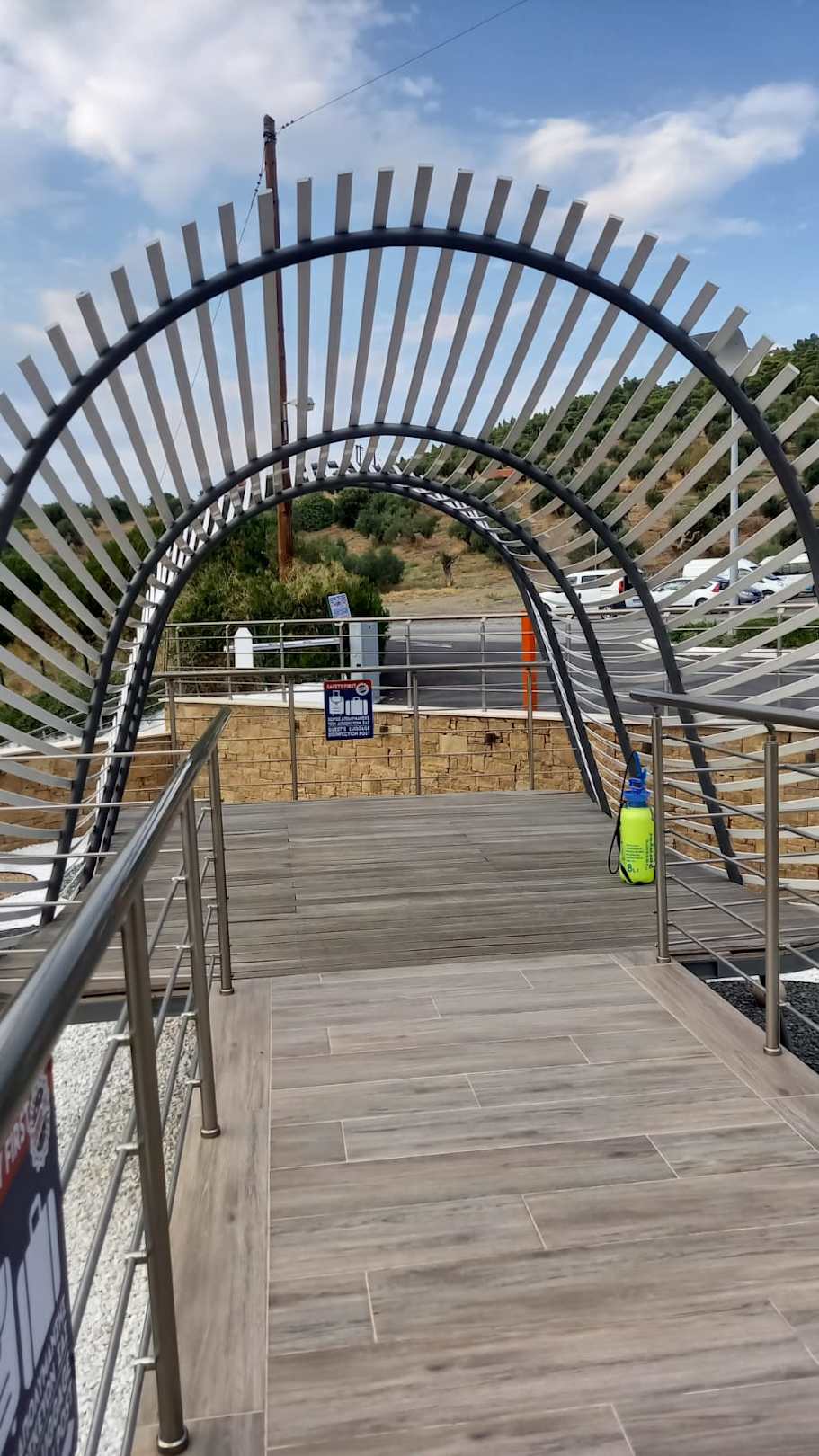 Vor dem Eingangsbereich werden die Koffer desinfiziert