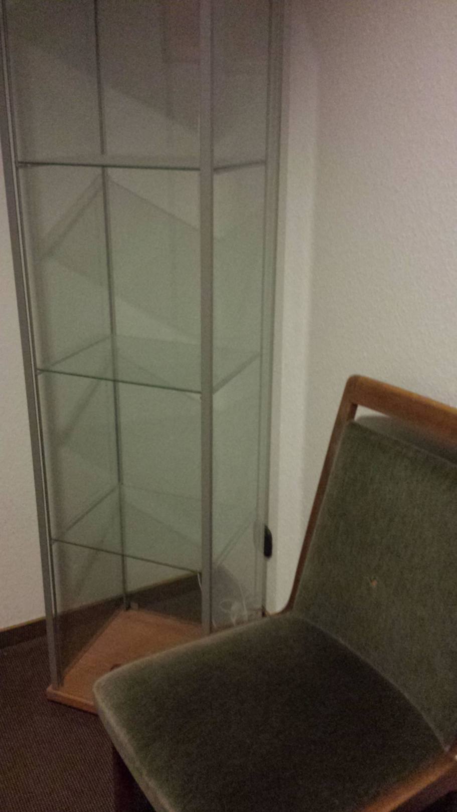 Leere Vitrine, alter Stuhl im FlurLieblos hingeknallt vor dem Aufzug: eine leere Vitrine und ein Stuhl mit kaputtem Bezug
