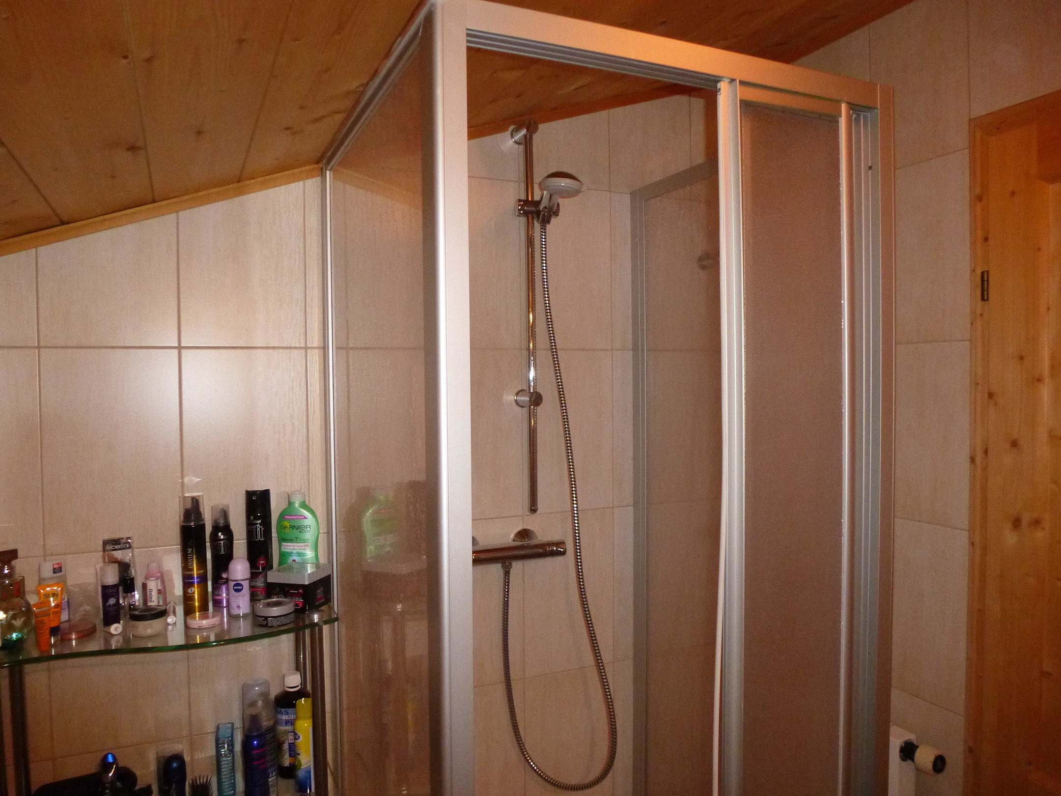 Dusche und Regal im Bad