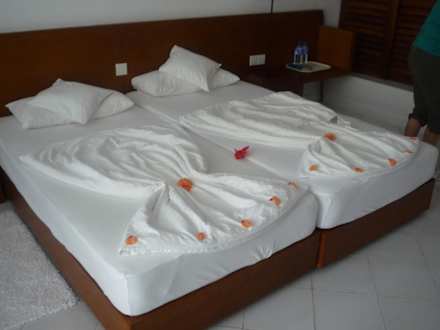 Morgens und abends immer ein neues Motiv mit vielen Blüten auf unserem Bett zu sehen