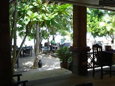 Blick vom Frühstücksraum zum Strand