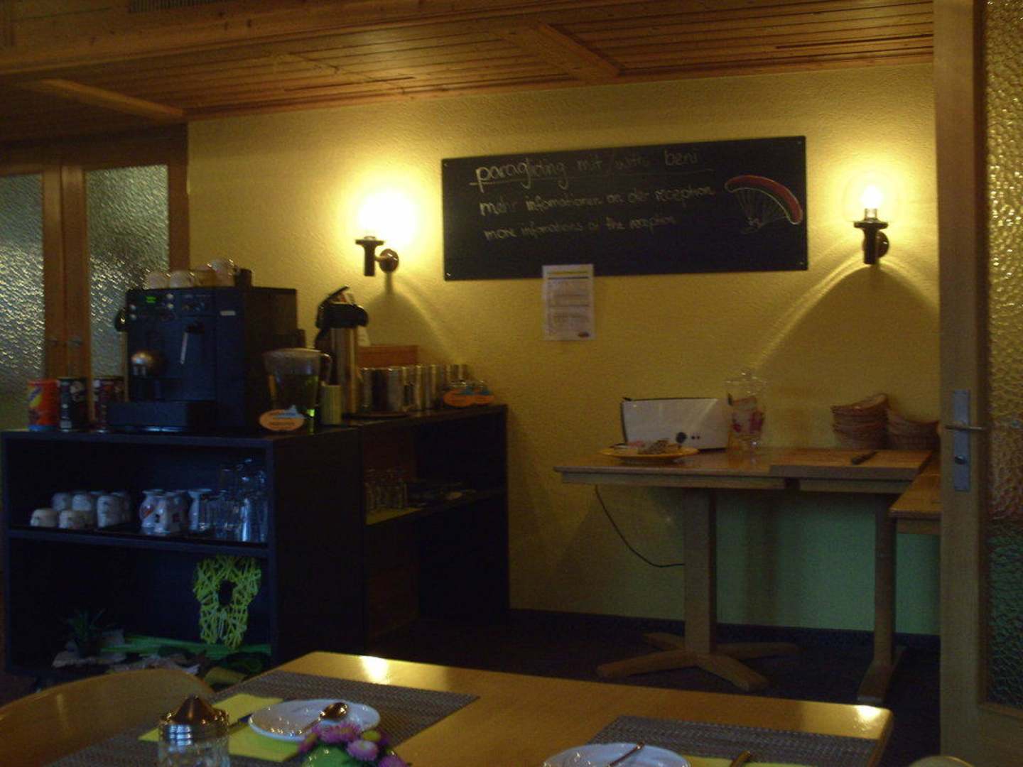 Brot, Kaffee, SäfteBlick auf eine Station im Frühstücksraum mit Tafel (Gast kann mit Hotelchef im Tandem für 170 CHF paragliden)