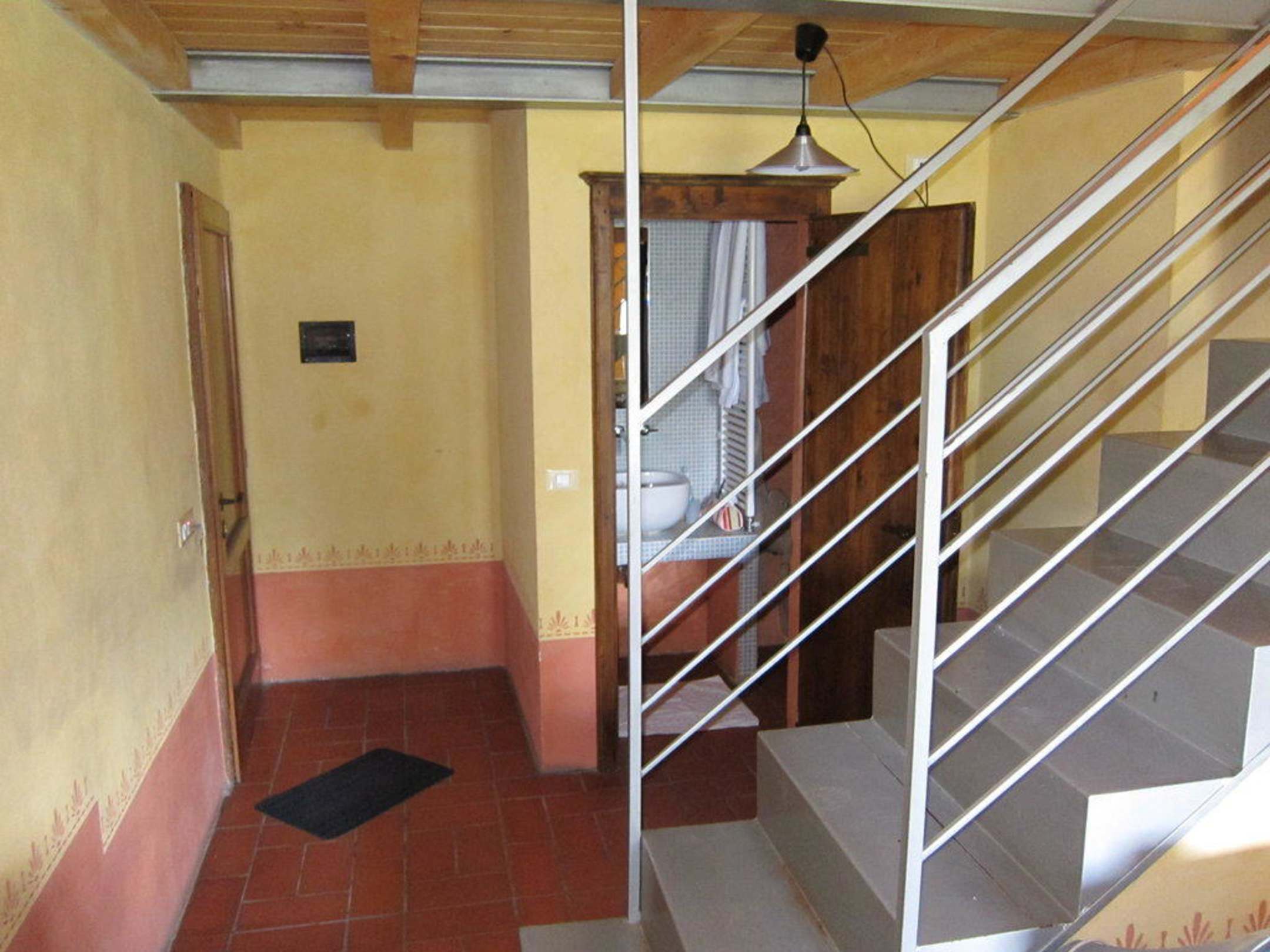 Von der Terrassentür aus aufgenommen: Links im Bild ist die Eingangstür, oben auf dem hözernen Zwischenboden steht das Bett. Links unter der Treppe ist die Kochecke mit Kühlschrank, Spüle und 2 Herdplatten.