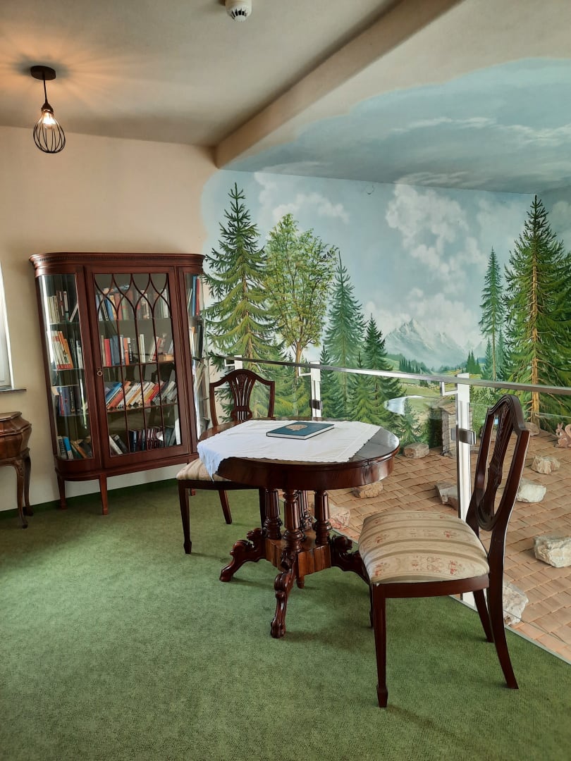 im 1. Stock eine Bibliothek mit gemütlicher Sitzecke