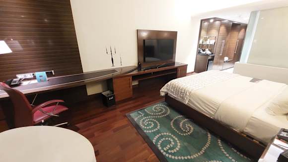 ZimmerZimmer, Blick vom Sofa in Richtung Schreibtisch, Fernseher und Bett. Hinten rechts die Kaffee-/Tee-Zubereitungsmöglichkeit mit Minibar.