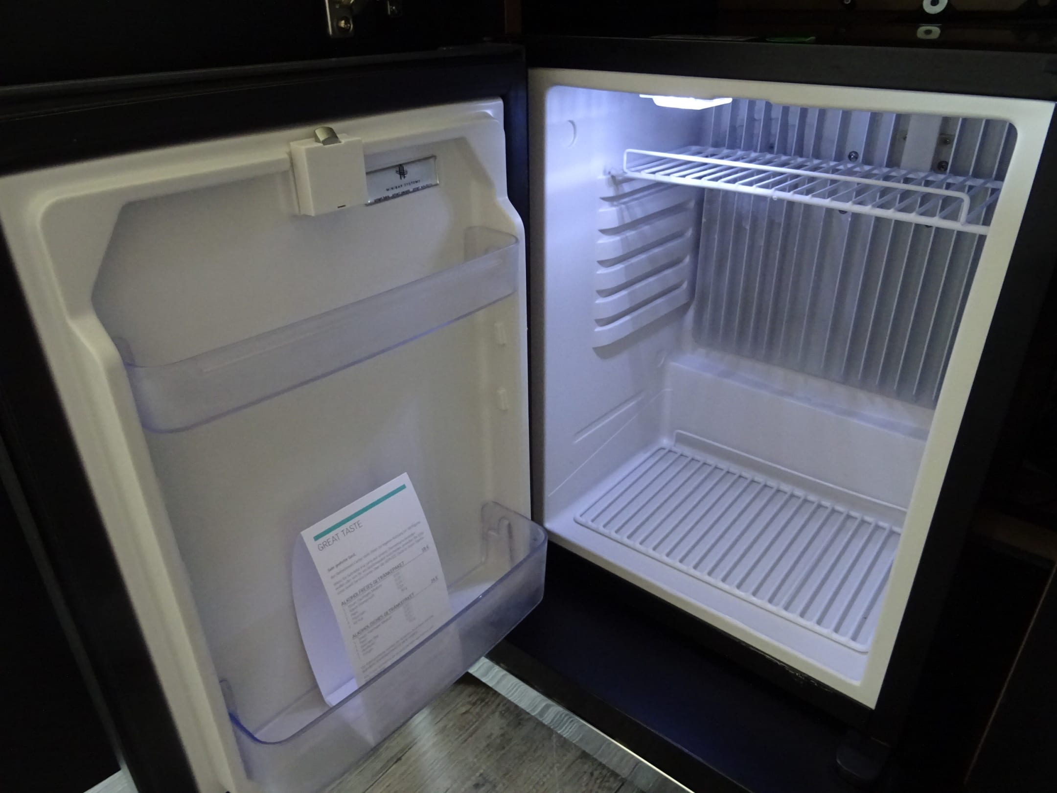 Minibar im Zimmer. Getränke können bestellt werden und werden dann frisch aufs Zimmer gebracht.