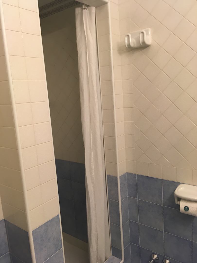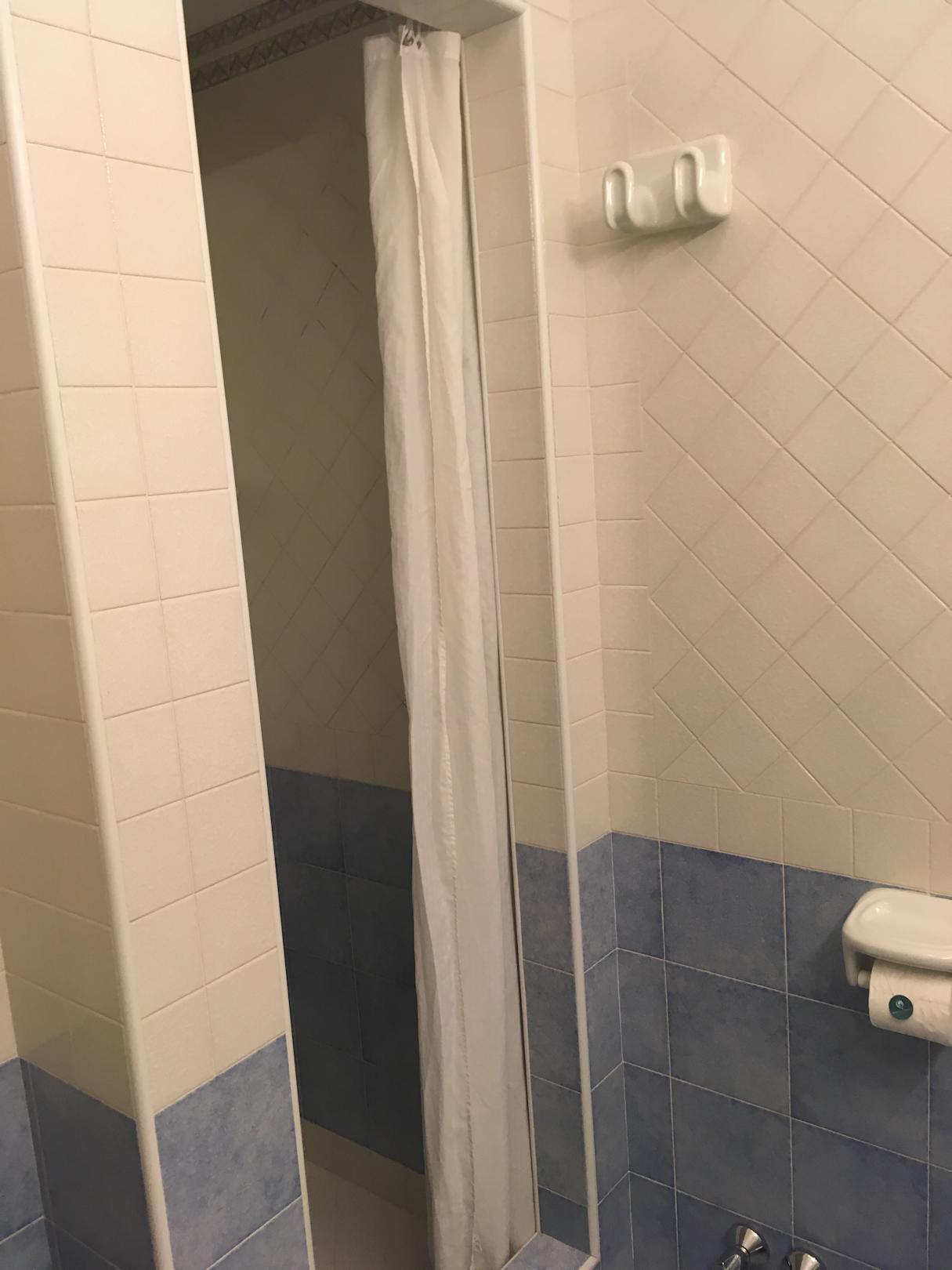Dusche mit Vorhang im Zimmer 207