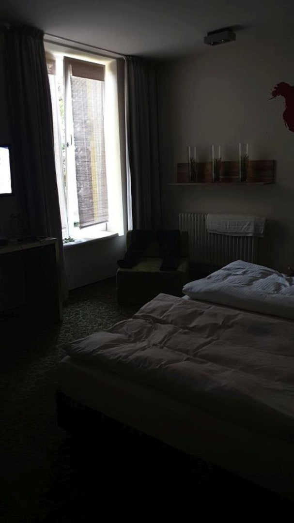 Lt. Hotelprospekt Zimmer mit " Flair". Ein "superior-Zimmer, gehobene Preisklasse, sehr dunkel.