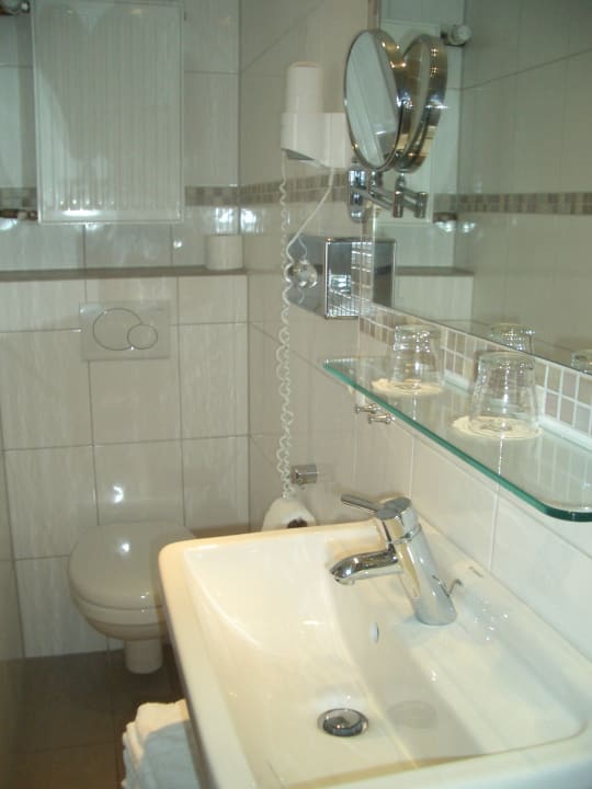 ZimmerToilettensitz zu tief, sonst Fön, Kosmetikspiegel und am Becken und in der Dusche Waschgel-Spender