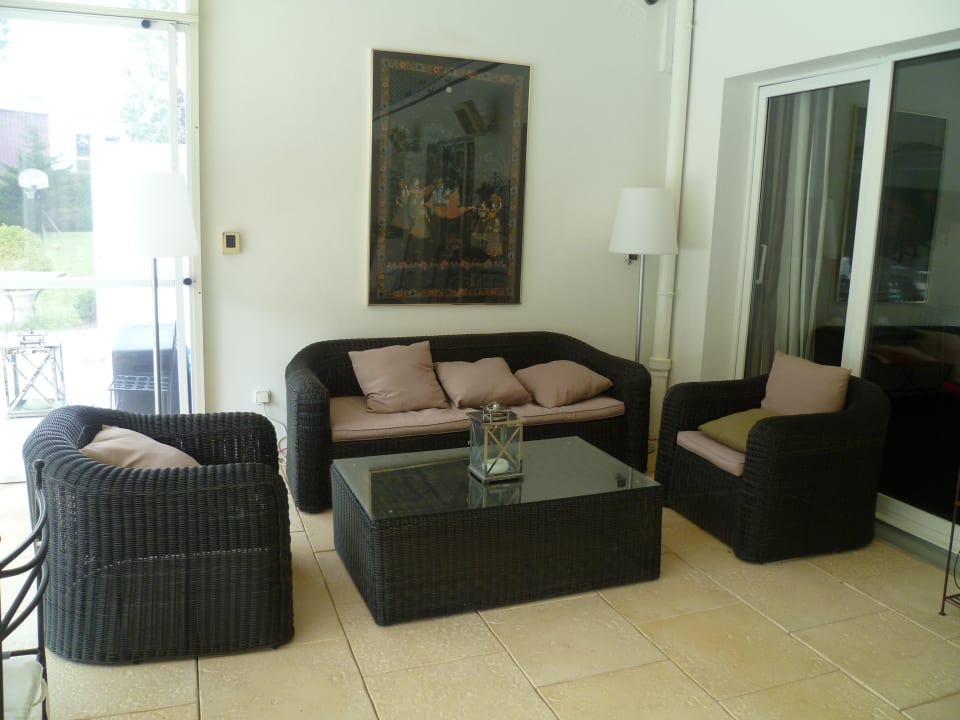 Sitzgruppe im Wintergarten mit Blick auf Pool