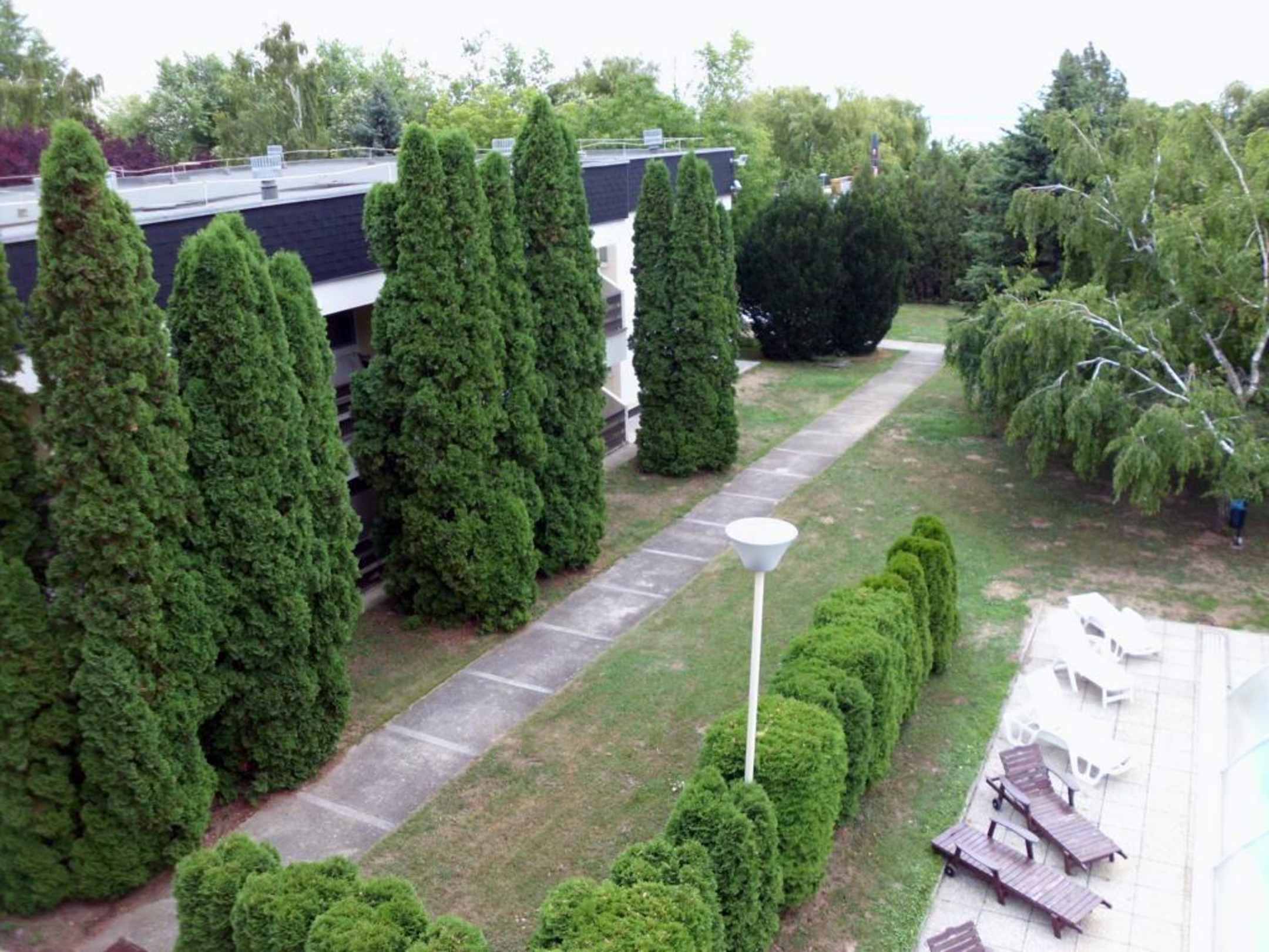 Die Sicht von unserem Zimmer aus ... Etwas Balaton, viel Grün und auch der Pool (der aufgrund des Wetters leider mehr abgedeckt als offen war)