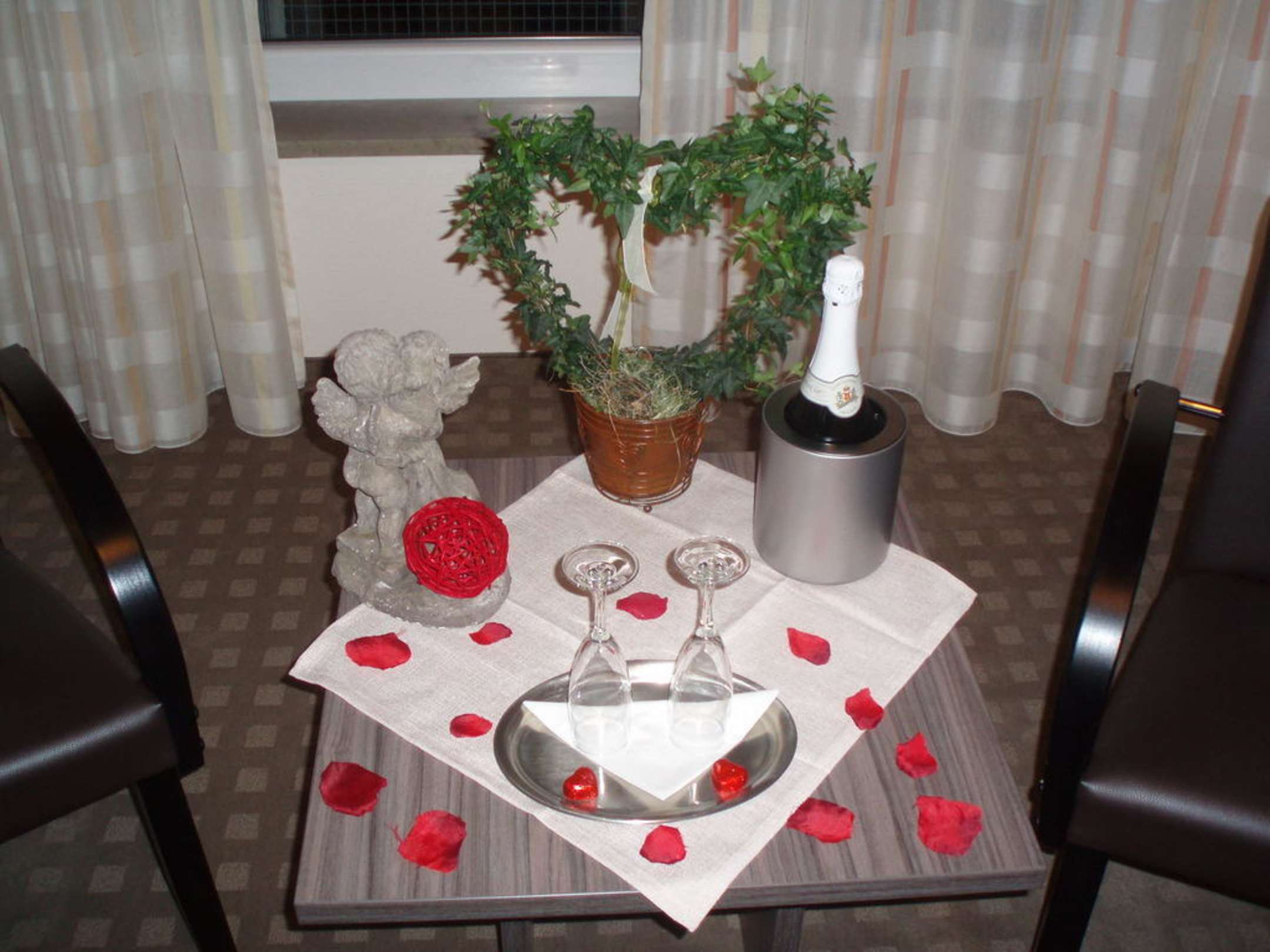 Romantisch dekoriert mit sekt und Schokoherzen