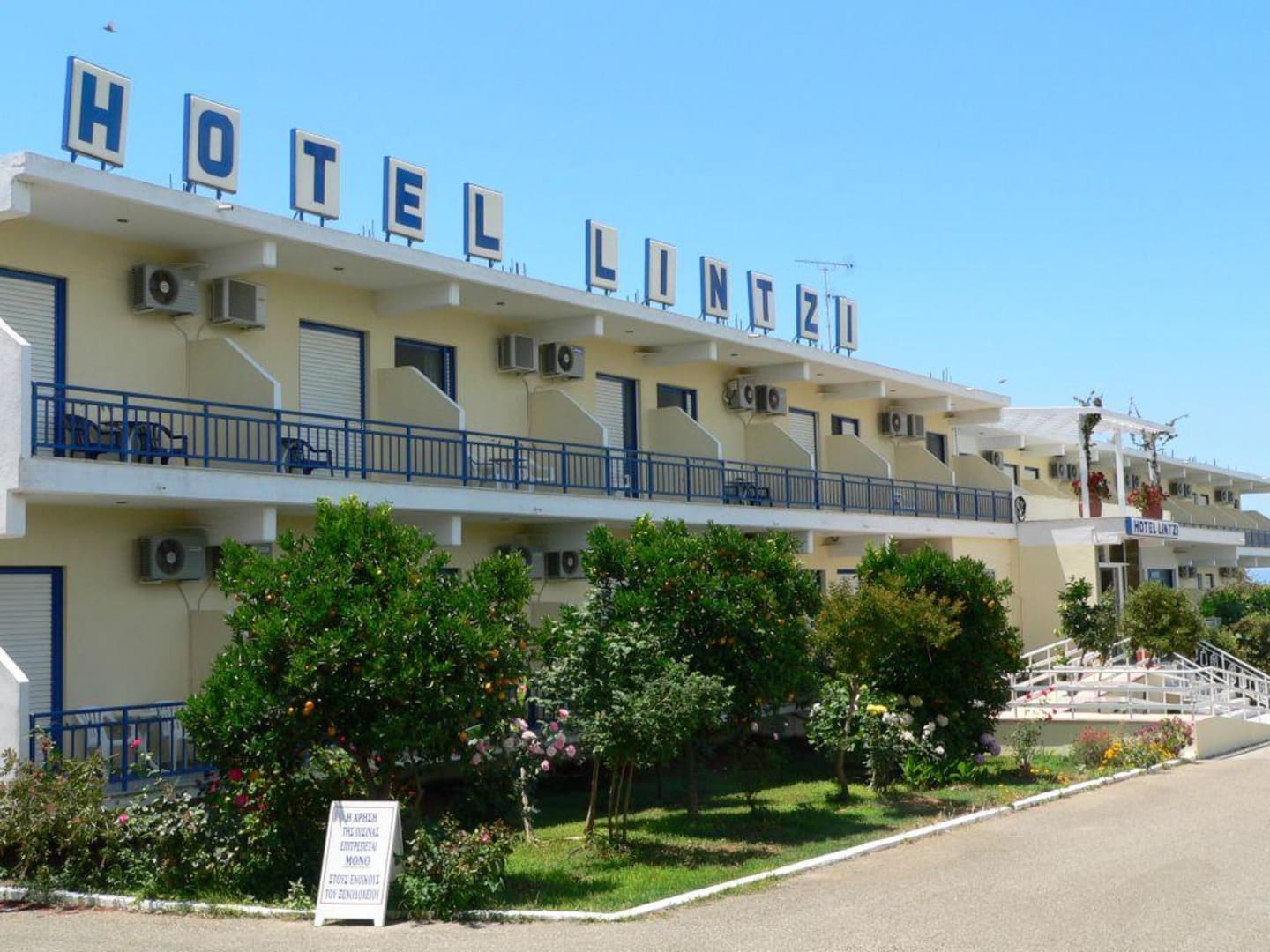 Aussenansicht des Hotels Lintzi in Arkoudi mit Eingangsbereich