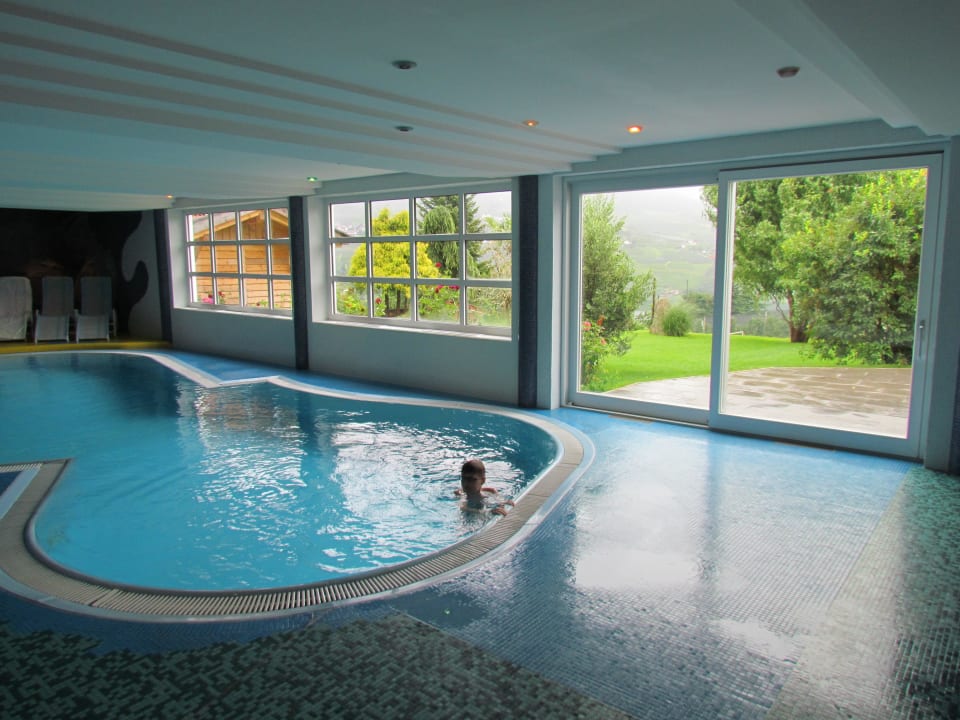 InnenpoolKindergerechtes warmes Wasser für Schwimmer oder Kinder ab 150 cm, Ruheliegen, Hot-Wirlepool, Zugang zum Außenpool und Liegewiese