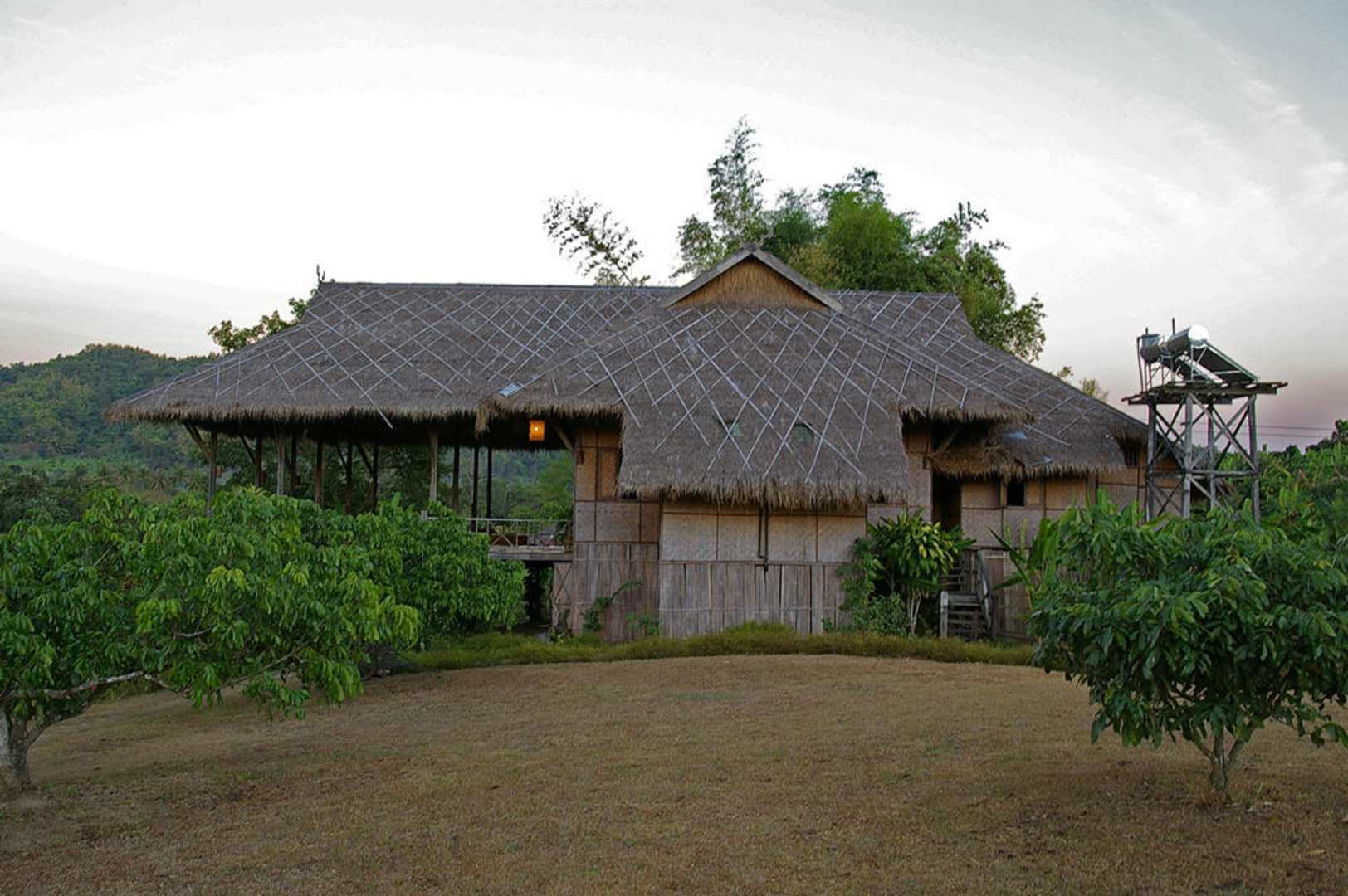 Dies ist eines der Gästehäuser mit großer Veranda. Rechts kann man die Warmwasseranlage sehen.