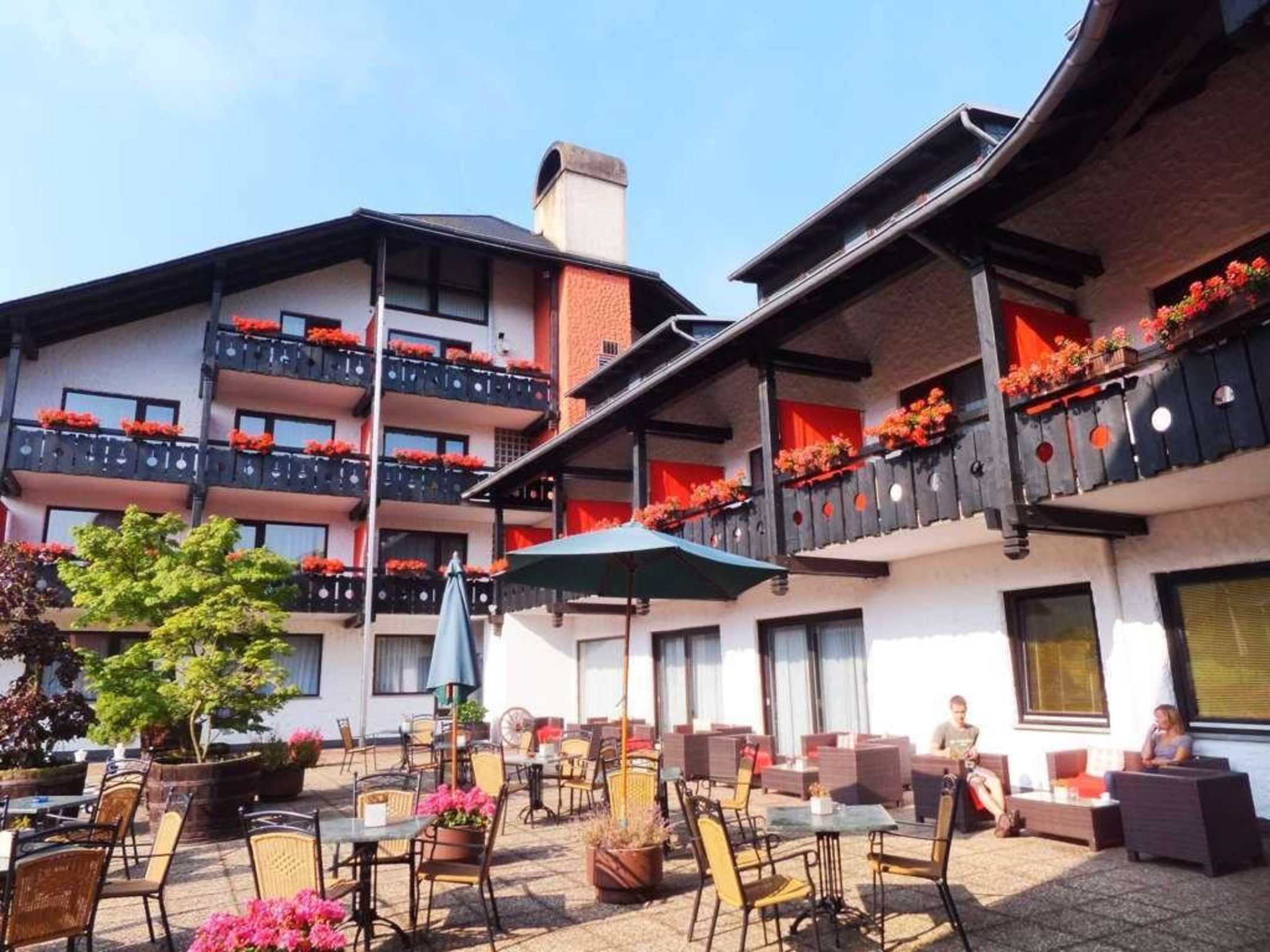Überblick über die große Hotelterrasse, Hinterfront  Hotel Lochmühle