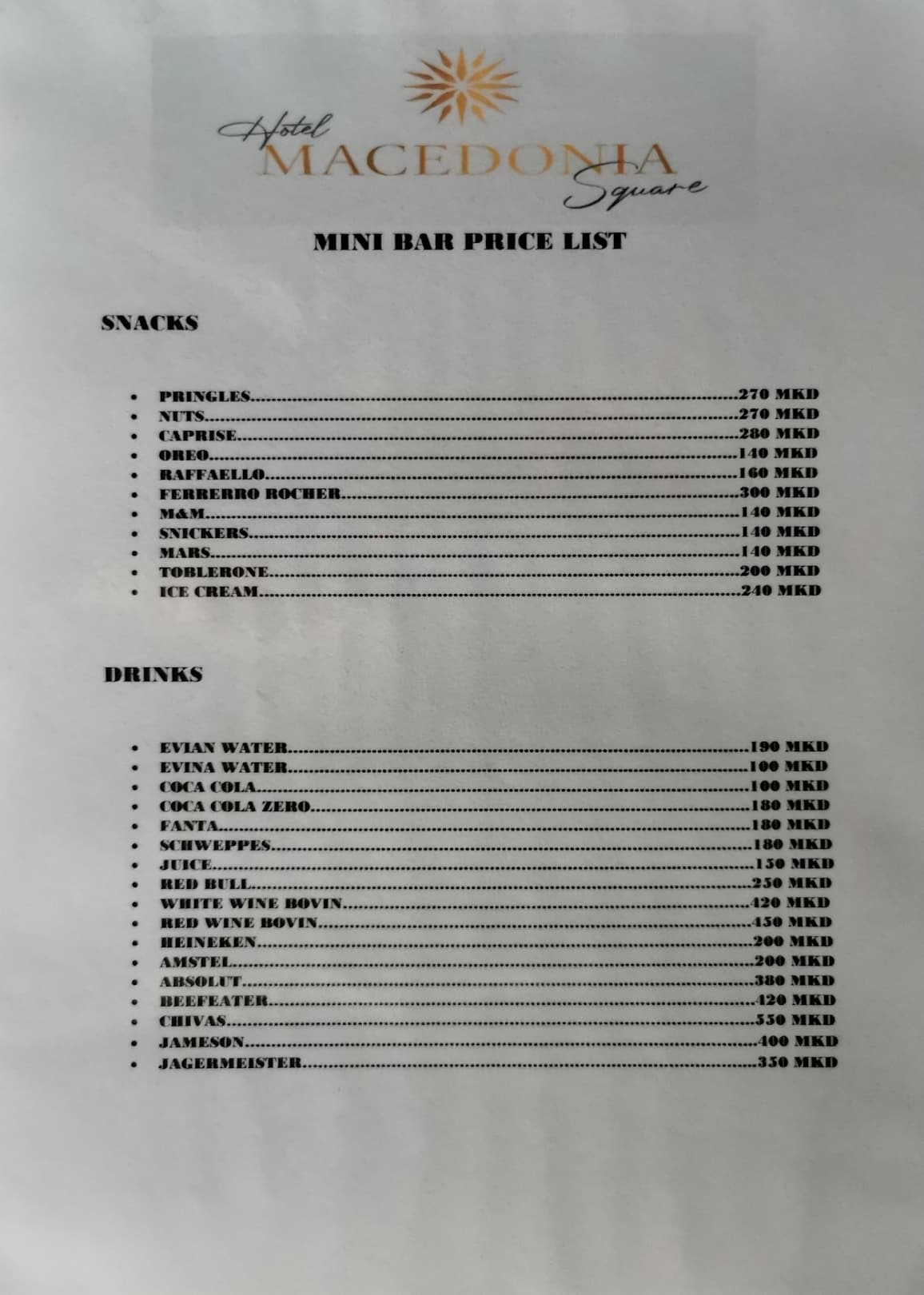 Minibar Preisliste