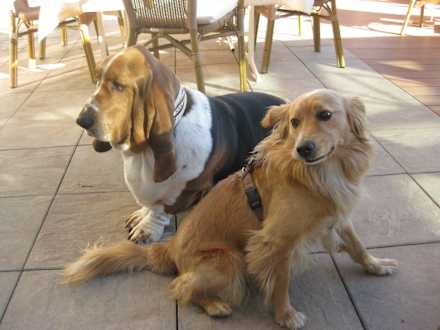 Basti der Hotelhund begrüßt Bela auf der Terrasse