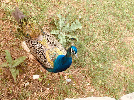 die Pfauen sind über die ganze Anlage verteilt und sehr neugierig