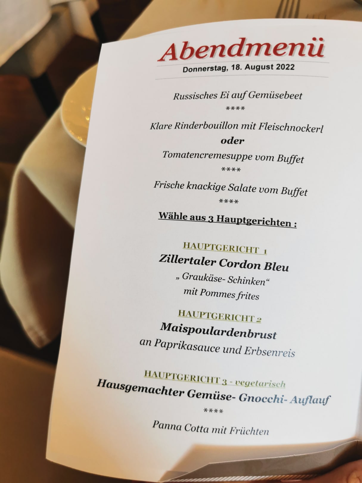 Menüauswahl! Alternativ konnte auch Pizza gewählt werden.