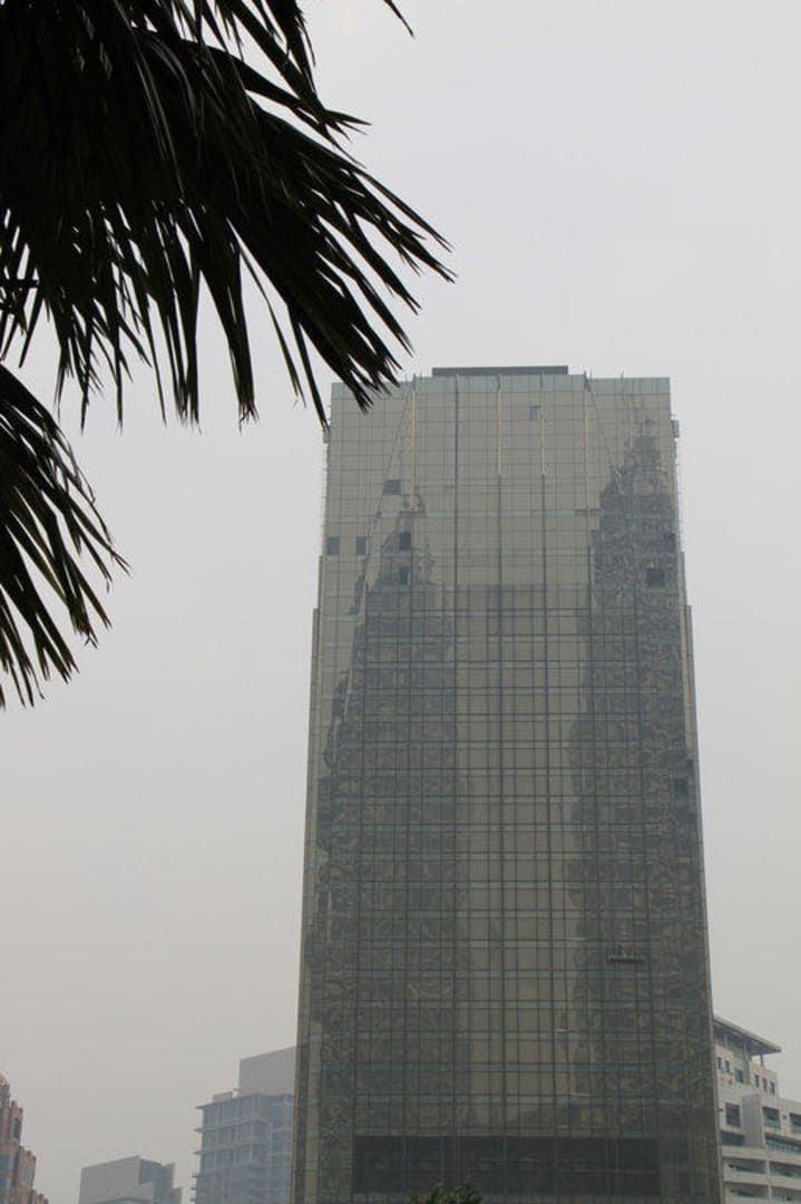 Blick vom Pool auf die sich im Nebengebäude spiegelnden Petronas Towers