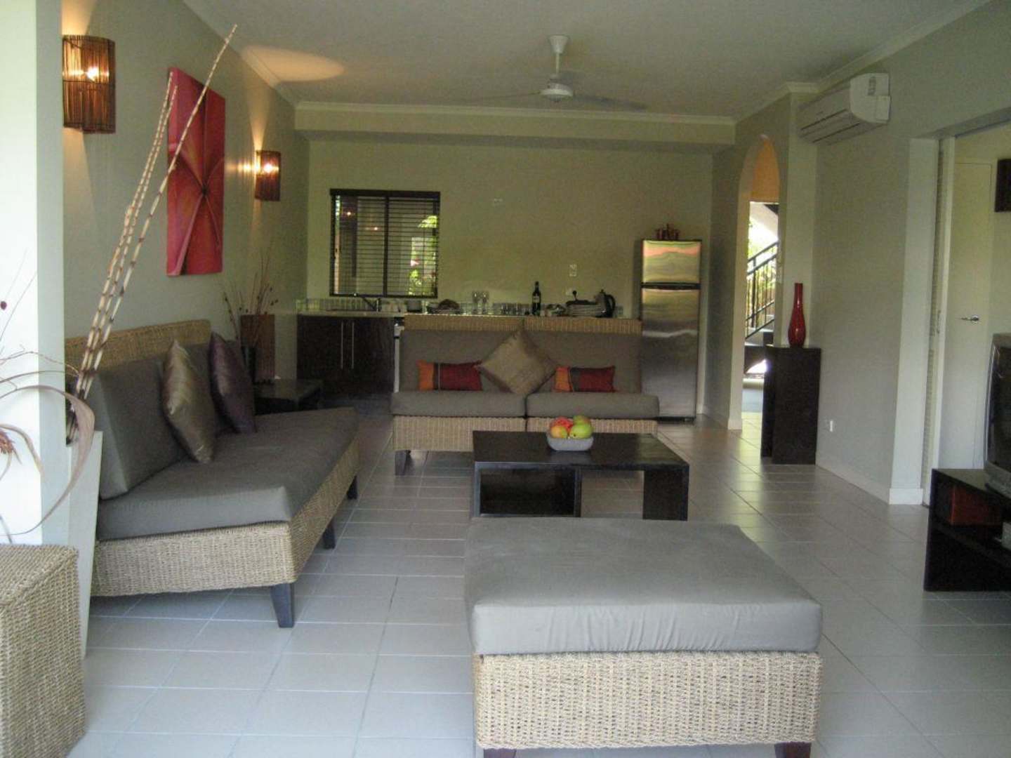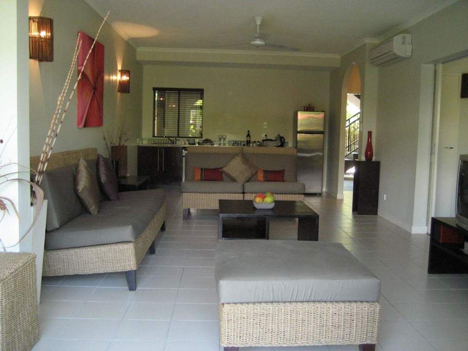 ZimmerDas war mein Zimmer, fotografiert von der kleinen Terrasse aus. Wirklich riesig und sehr stilvoll eingerichtet. Es lassen sich mehrere Türen öffnen und man kann direkt zum Pool gehen oder auch auf einer Liege auf der eigenene (ziemlich kleinen) Terrasse liegen. Im ersten Stock gibt es, soweit ich sehen konnte, keine Balkone. Also lieber Erdgeschoss buchen!