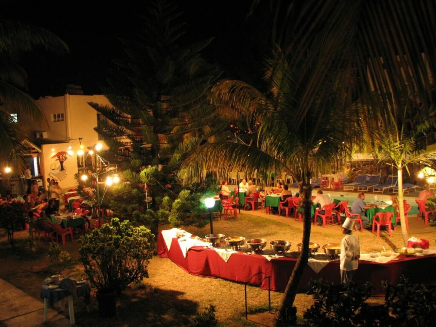 Blick vom Balkon eines Bungalows auf den Pool am Sega-Abend
