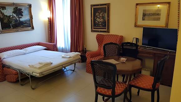 Aufgemachtes Bett im Wohnraum der Suite
