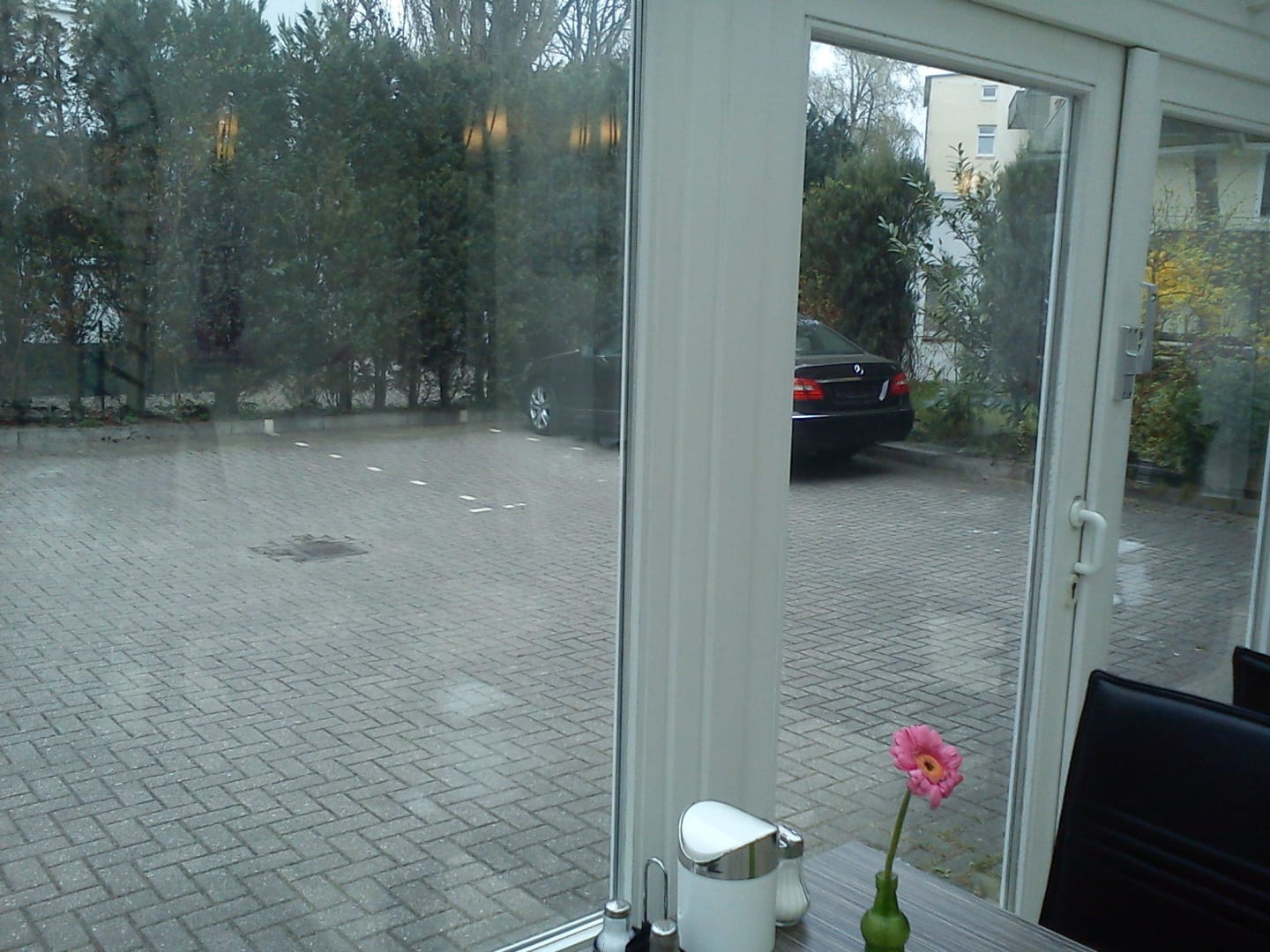 Blick aus dem Wintergarten zum Hotel-Parkplatz