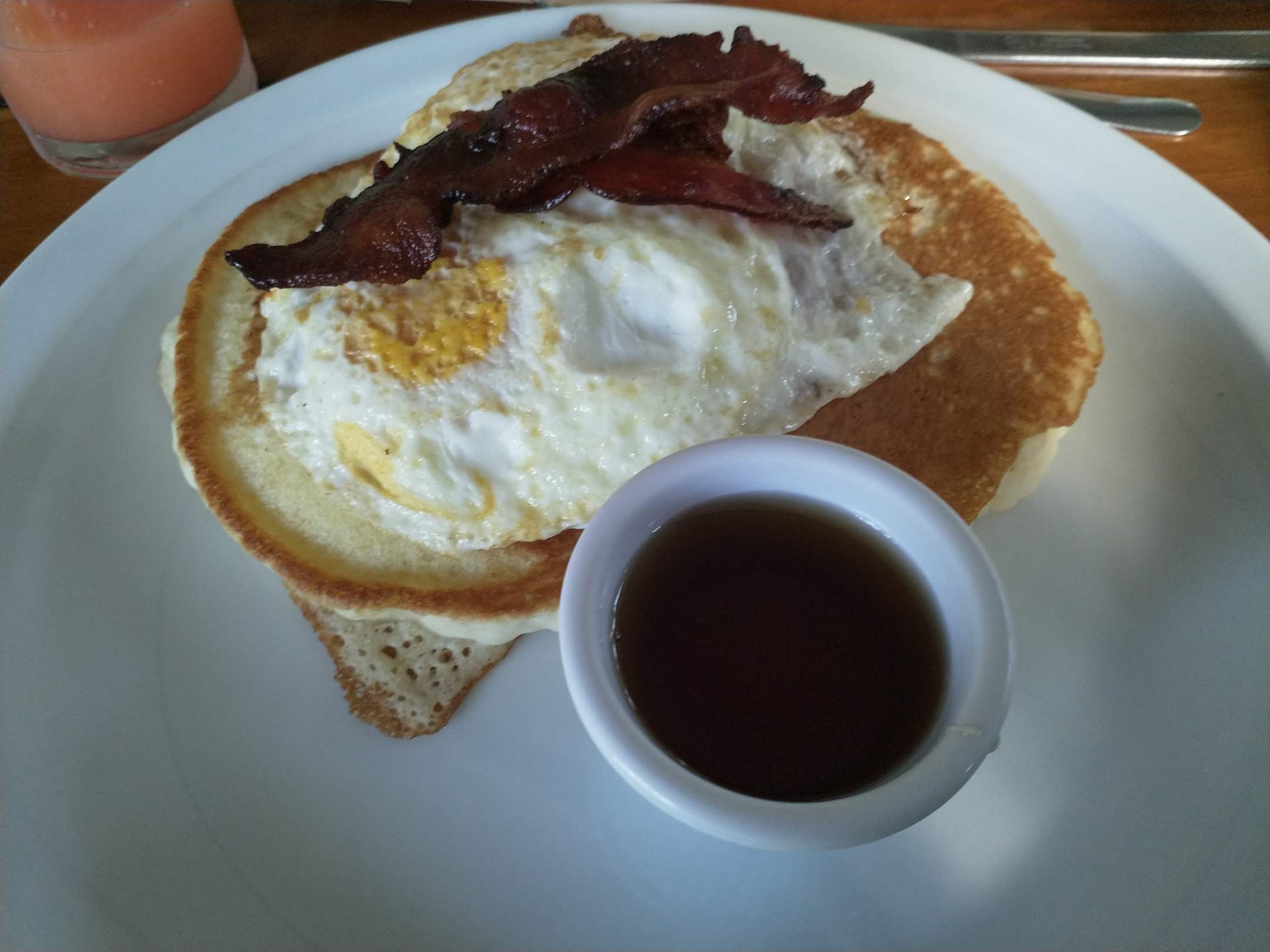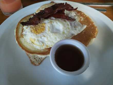 Frühstücksoption: Pancakes und Spiegelei mit gebratenem Speck