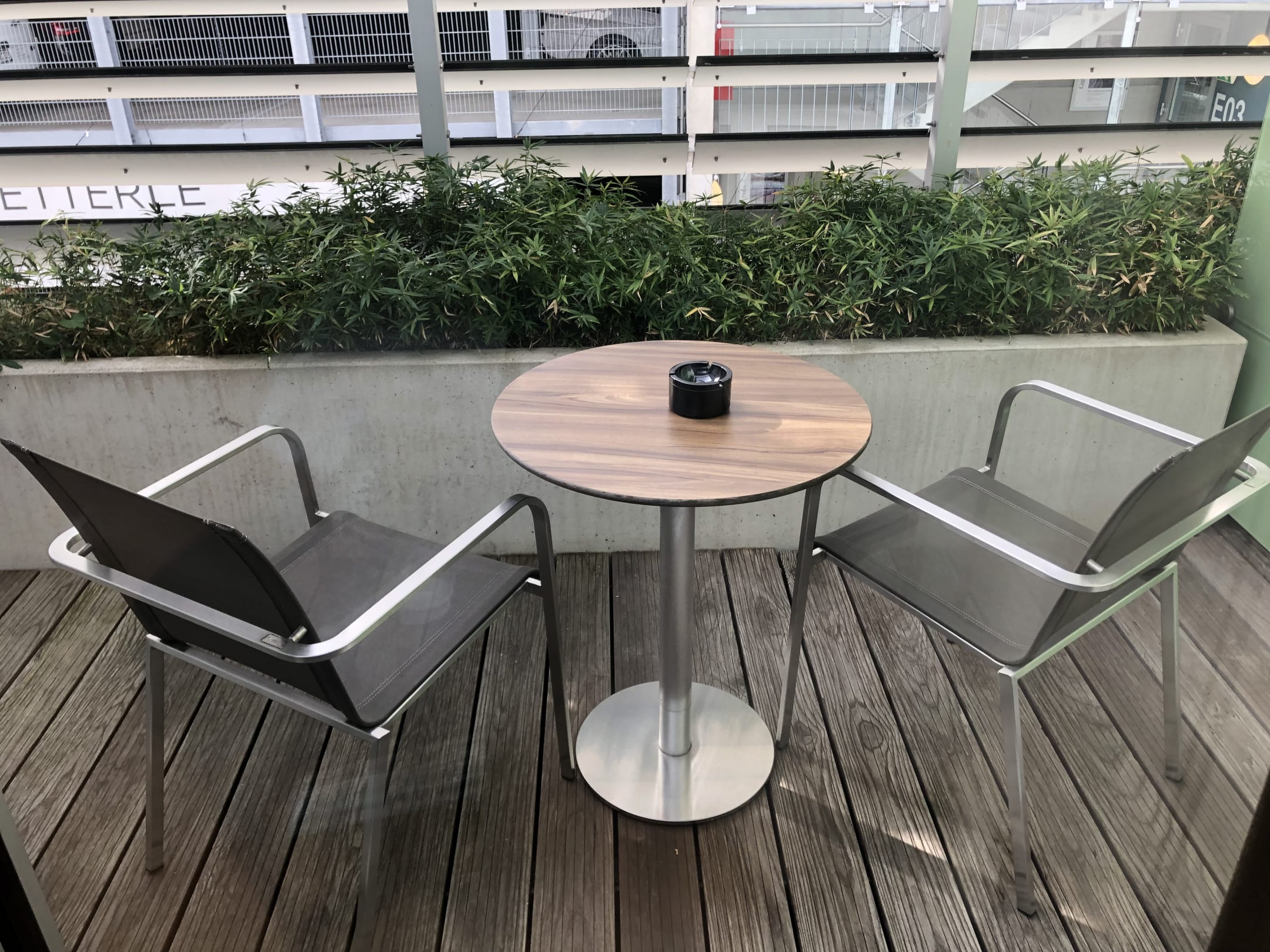Balkon mit Stühlen und Tisch. Geeignet für Raucher