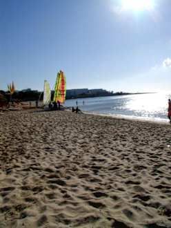 Der Strand mit einem Hobbie Cat im Hintergrund