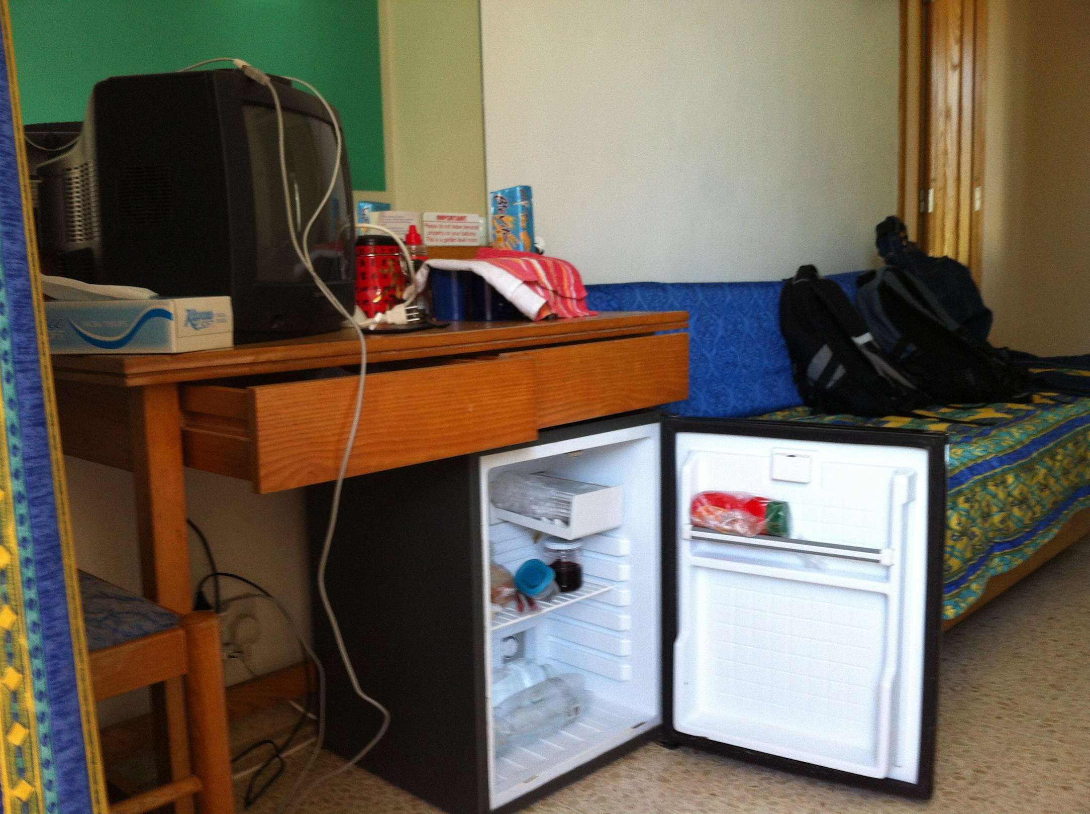 TV, Schreibtisch, Kühlschrank und drittes Bett