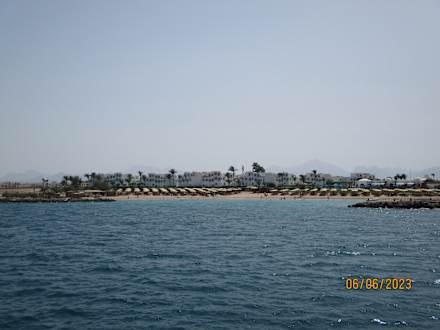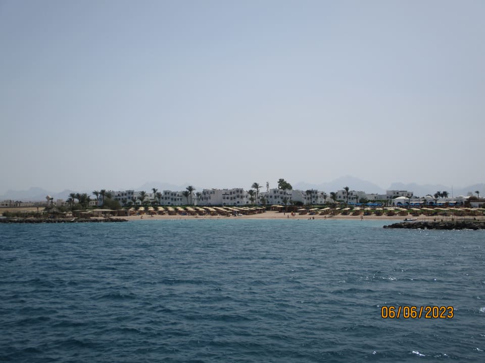 Blick vom Meer auf das Hotel.