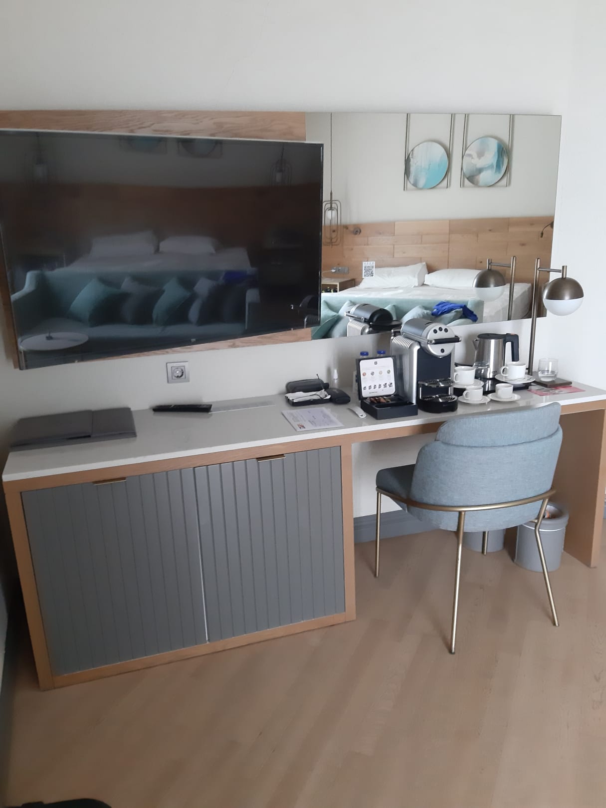 Zimmer 1 winzige Ablagefläche, links neben dem Stuhl im Schrank ist die Minibar
