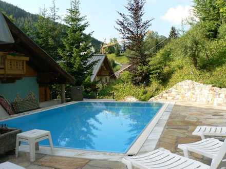 Aussenpool mit Liegen umgeben von Natur