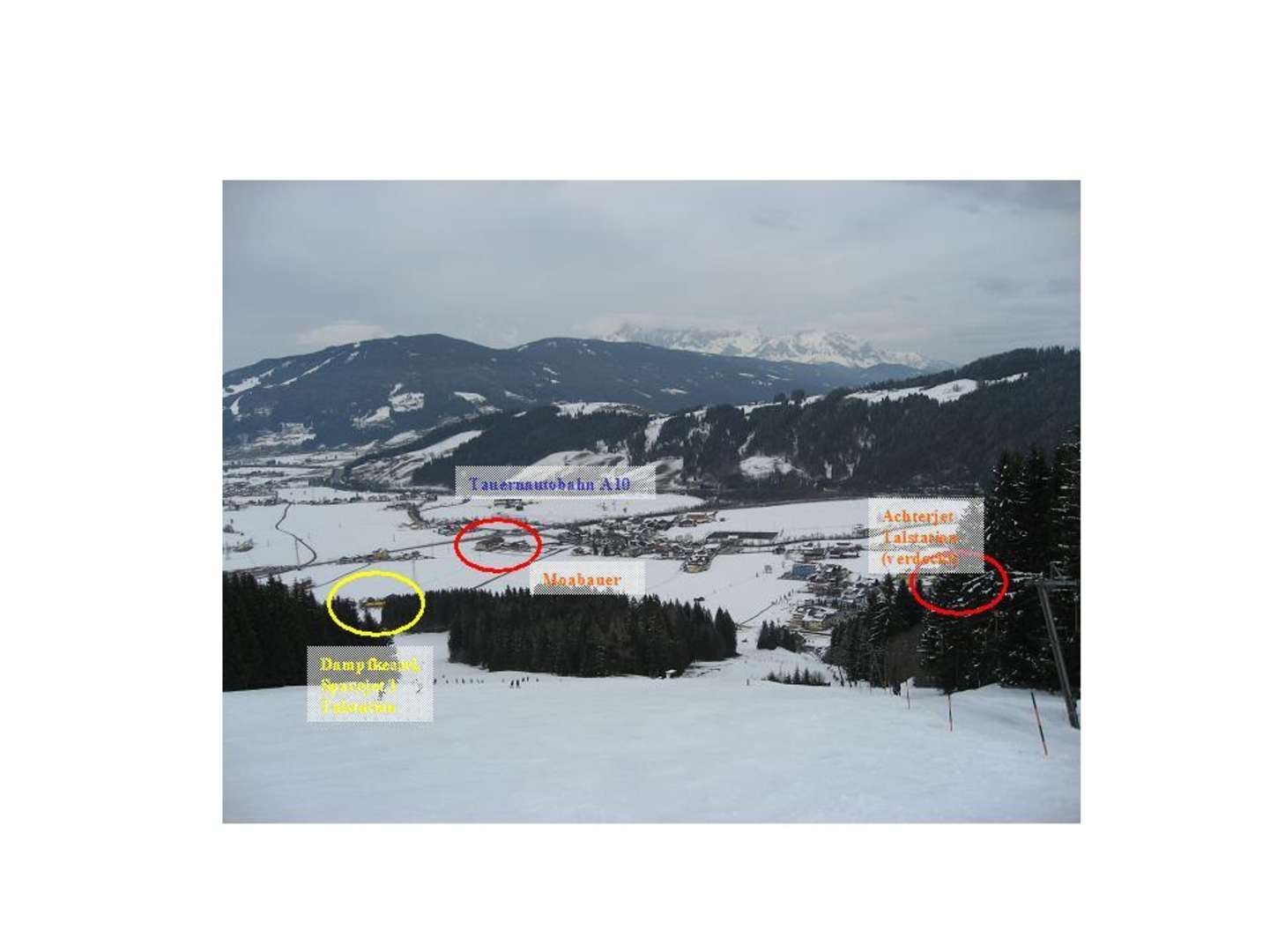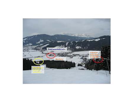Lageplan Flachau Nord / MoabauerBlick auf den nördlichen Ortsrand von Flachau, Lage von Dampfkessel, Spacejet 1, Moabauer, Achterjet