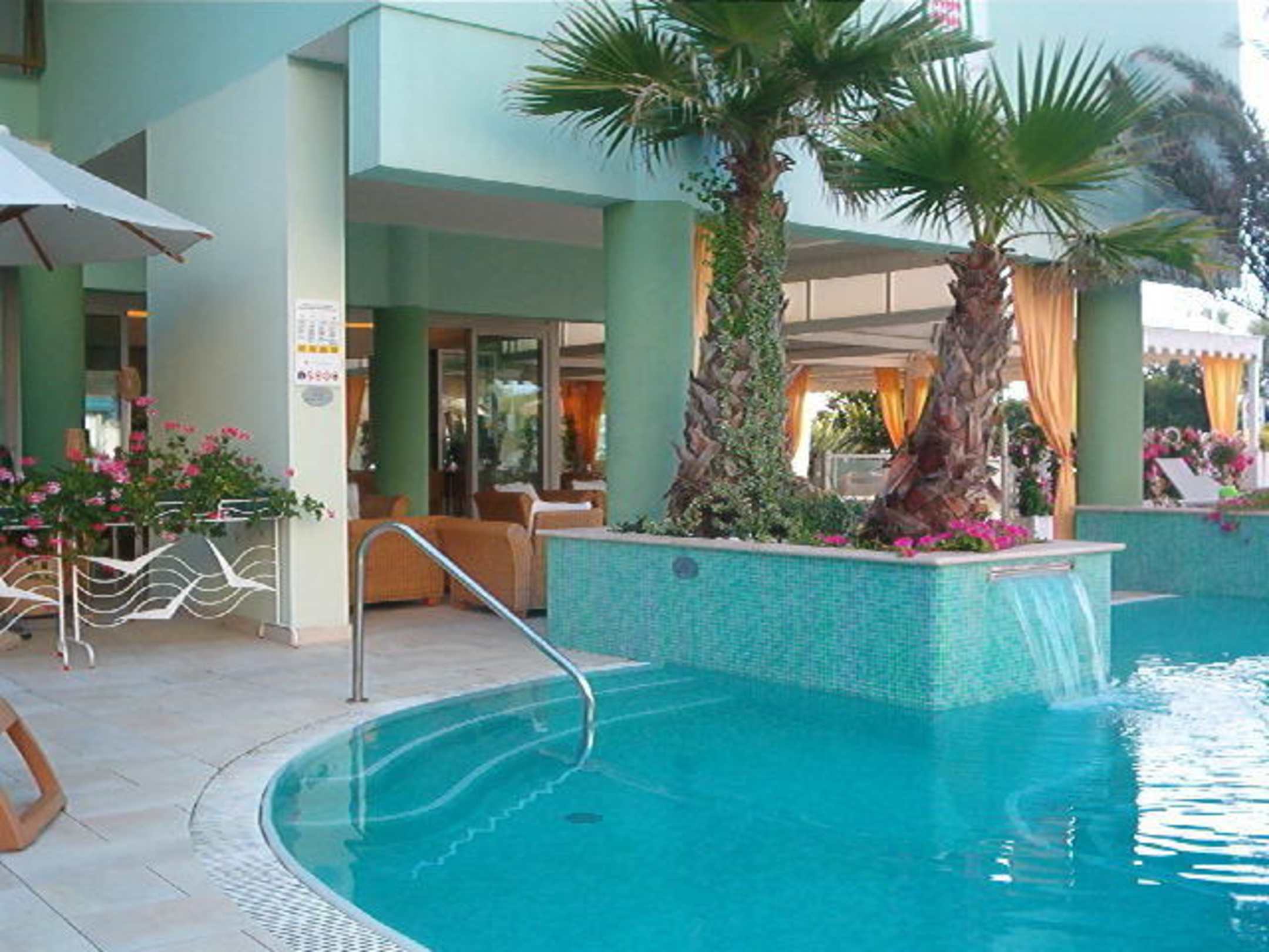 Blick über den Pool in die angrenzende Bar