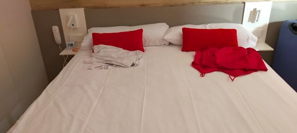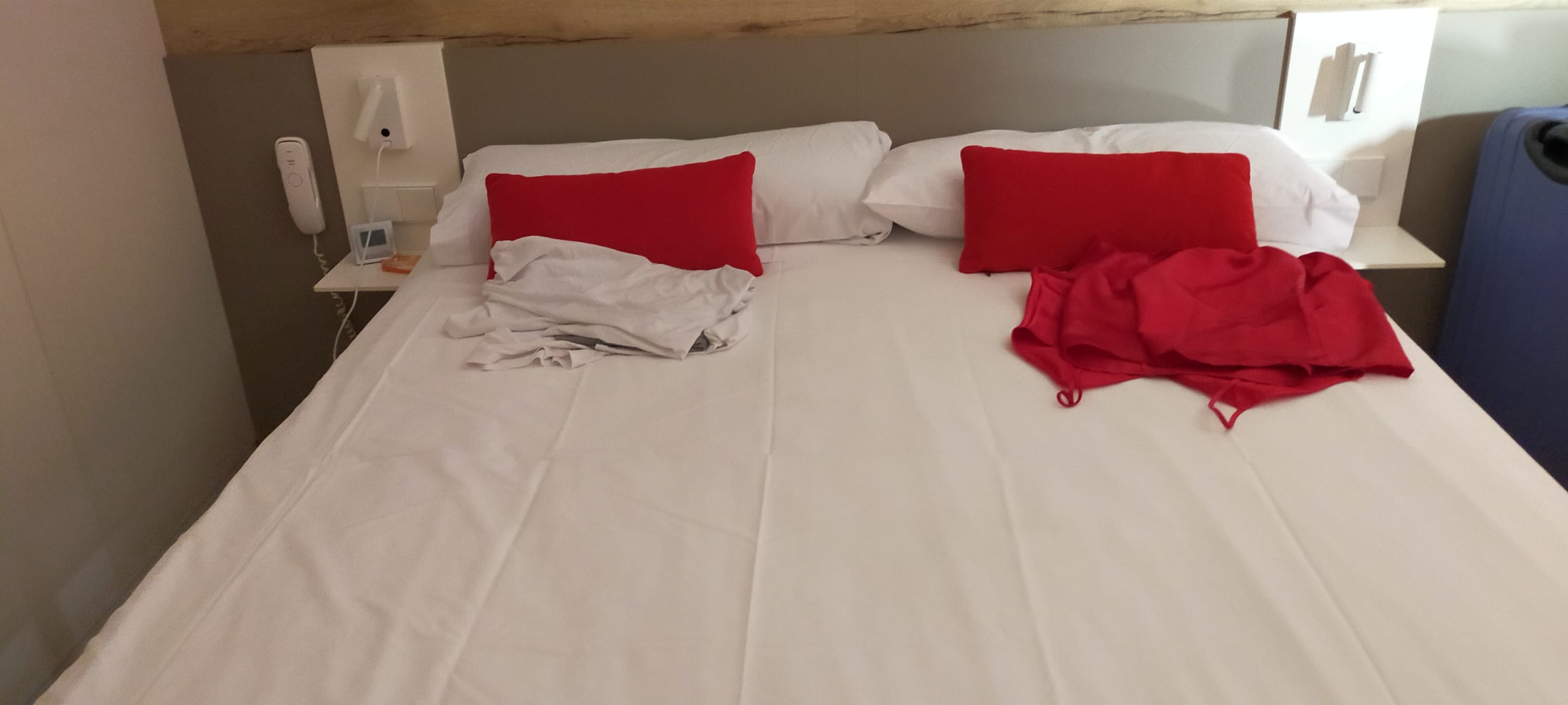 Sehr kleine Zimmer und das Pyjama nur entweder auf das Bett oder auf die Koffer gelegt,