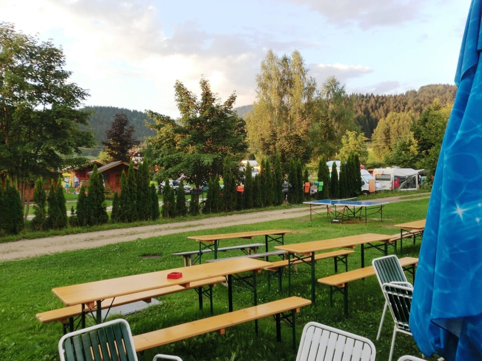 Im Hintergrund das Hüttendorf/Campingplatz